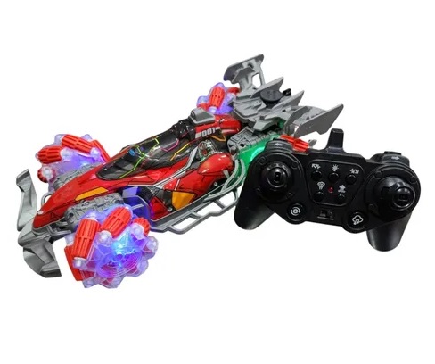 Com um design diferente e chamativo este carro comandado por controle remoto gira 360 graus, tem direção lateral, possui spray d’água, luz, som e música. Bateria recarregável e cabo USB incluso. São três cores sortidas, enviadas de acordo com a disponibilidade.