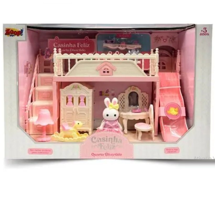 Conteúdo da embalagem: 1 bonequinha coelhinha vestida com um lindo vestido rosa e laço amarelo;1 guarda-roupa com portas que abrem;1 penteadeira com espelho e banquinho;1 cavalinho de balanço amarelo;1 abajur rosa;1 escorregador rosa;1 andar superior com sacada e escadinha lateral;1 conjunto de acessórios extras (óculos e tiaras)