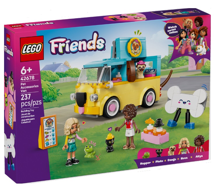 Pequenos apaixonados por animais podem soltar a imaginação com o conjunto LEGO® Friends Van de Acessórios para Animais de Estimação. O conjunto inclui 2 minibonecas e as figuras de um gatinho, cachorro e sapo, além de acessórios AUdoráveis. Depois de montar, admire a van em forma de pug e veja seu rabo abanando enquanto se move! Use a criatividade ajudando os animais de estimação a experimentarem diferentes chapéus, incluindo um chapéu de chuva, de caubói, uma cartola e uma coroa de flores. Confira o mascote de osso adorável, depois carregue a van com acessórios para a próxima aventura. São 237 peças para montar e brincar.