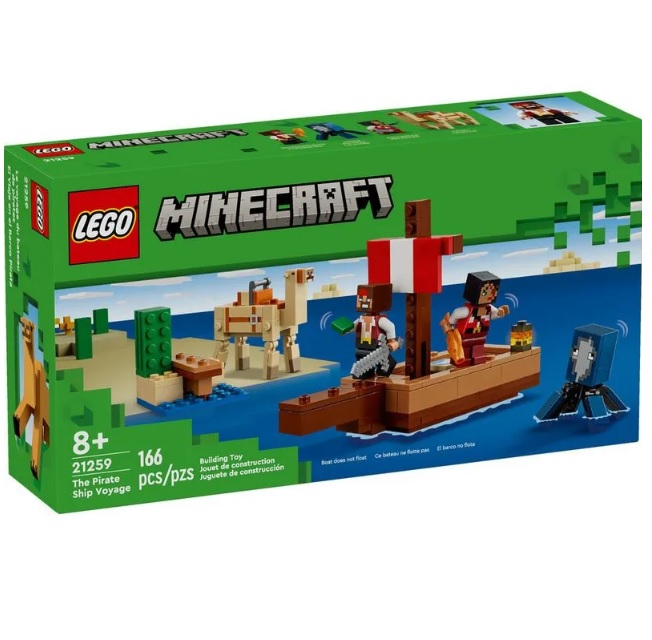 Embarque no barco com 2 piratas LEGO Minecraft e navegue rumo à aventura no bioma do Deserto. O que é aquilo na água? É uma lula! Busque terra firme e encontre um camelo!