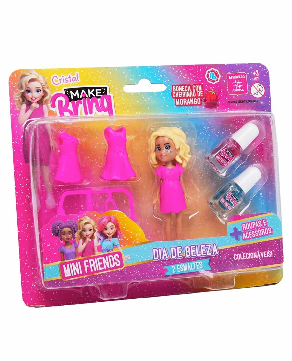 Com roupinhas estilosas e acessórios de beleza, a bonequinha Mini Friends com cheirinho de fruta está pronta para um visual deslumbrante. Ideal para quem adora criar looks incríveis, este conjunto inclui dois esmaltes para a criança aprovados pela Anvisa. São três modelos sortidos, enviados de acordo com a disponibilidade.