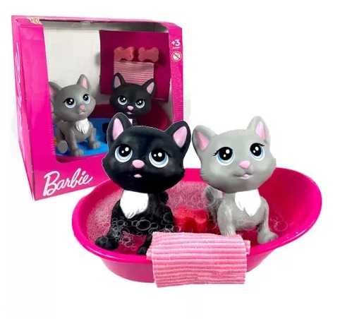 É hora de dar banho nos pets da Barbie! Coloque as gartinhas na banheirinha e esfregue bem com as esponjinhas em formato de peixinho. Depois do banho, é só secar com a toalhinha. As cores dos gatinhos podem variar.