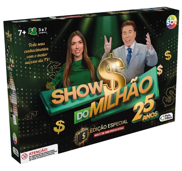 Teste seus conhecimentos com o maior sucesso da TV! A Edição Especial de 25 Anos do Show do Milhão é um item indispensável para colecionadores e fãs de jogos de perguntas e respostas! Comemore os 25 anos do programa mais icônico do SBT com esta Edição Especial! Um jogador será escolhido para ser o apresentador, responsável por ler as perguntas e conferir as respostas. Os demais jogadores serão os participantes da partida. Cada participante escolhe um peão e recebe as fichas, que representam as alternativas das perguntas. Além das fichas de resposta, o jogo também conta com fichas de auxílio, como pular a pergunta, consultar os outros jogadores e consulta virtual, que deixam a partida ainda mais estratégica e emocionante. Durante sua vez, o jogador escuta a pergunta e escolhe a ficha correspondente à resposta que considera correta. As perguntas são divididas por fases e níveis de dificuldade, e a cada acerto o jogador avança no tabuleiro em direção ao milhão.