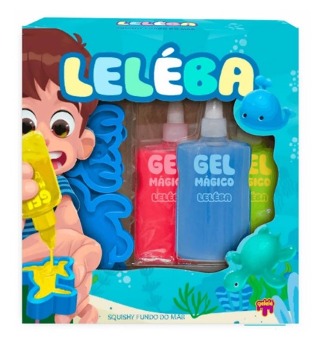 Conteúdo da embalagem: 3 cores sortidas de gel mágico, 4 forminhas de bichos do fundo do mar